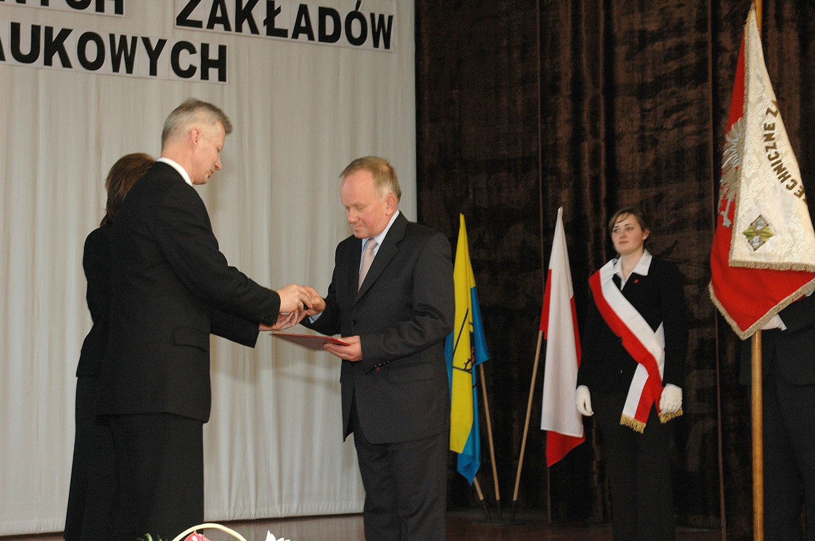 Następnie miało miejsce wręczenie „Złotej Tarczy Śl.TZN” – najważniejszej nagrody szkoły – dla osób, które rozsławiły jej imię – przez Panią mgr Janinę Lorenc, byłą Wicedyrektor Śl.TZN – Panu Lechowi Banasikowi.