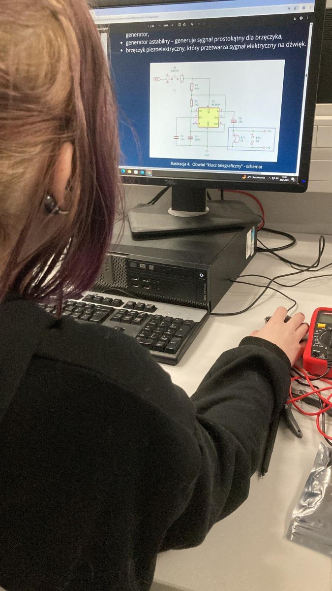 W ramach Koła Interdyscyplinarnego mechatronicy z klasy 1G spotykali się we wtorkowe popołudnia, by montować układy elektroniczne do nadawania sygnału alfabetem Morse’a.