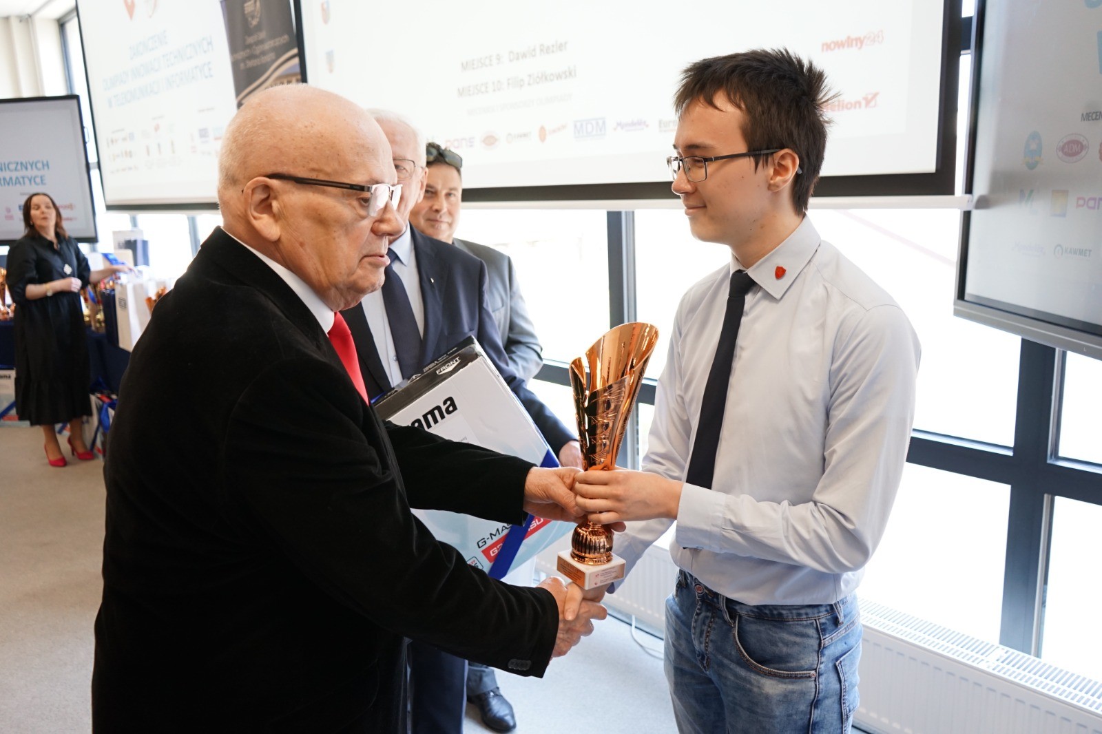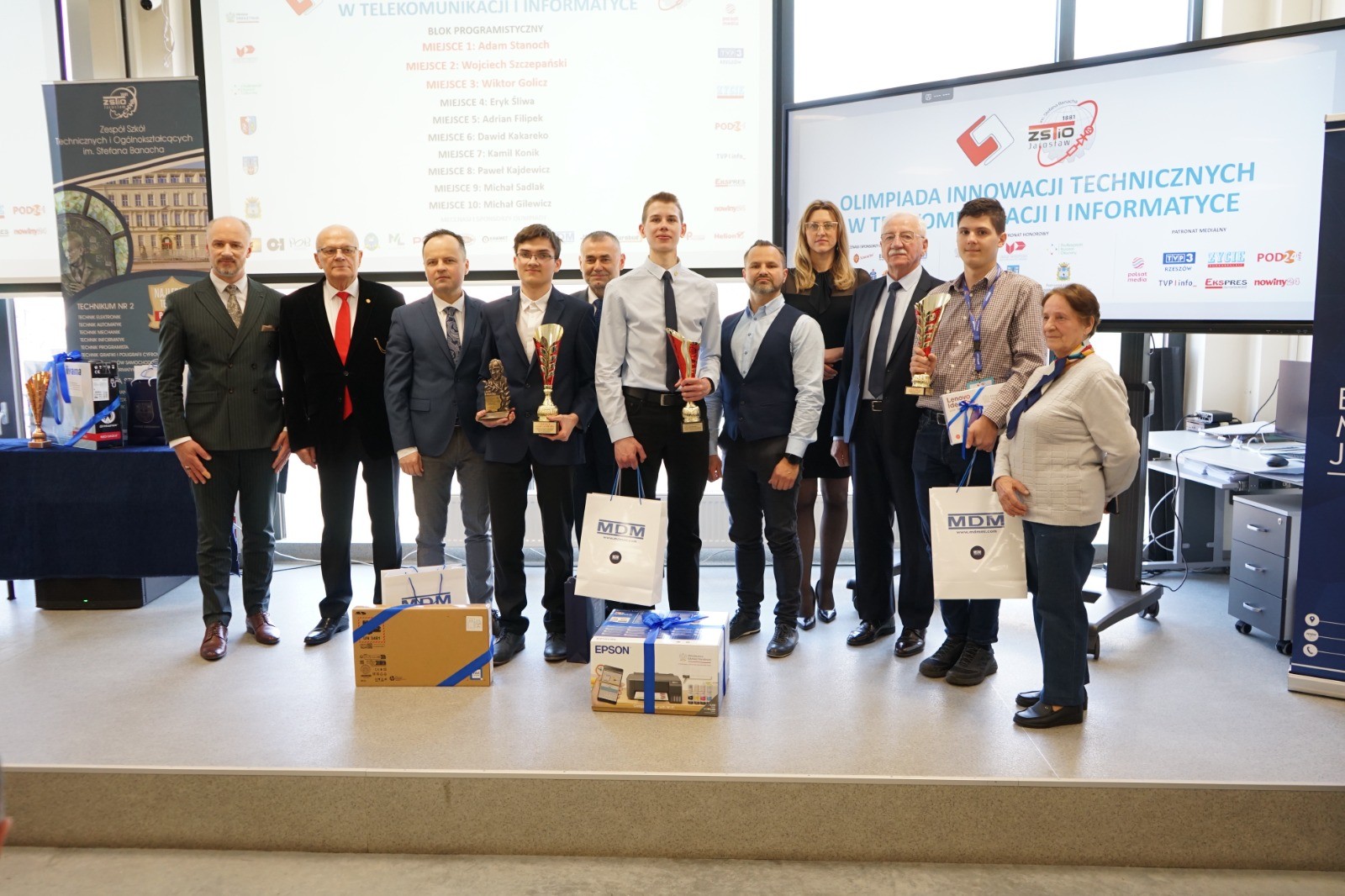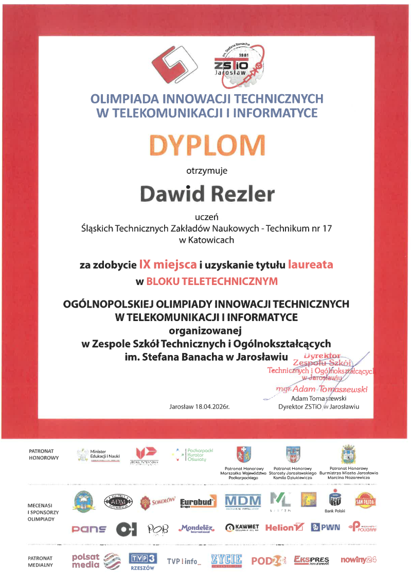 Wojciech Szczepański, uczeń klasy 4D, zajął 2 miejsce w bloku programistycznym. Mateusz Stańczyk i Dawid Rezler, uczniowie klasy 3D, zajęli odpowiednio 6 i 9 miejsce w bloku teletechnicznym.