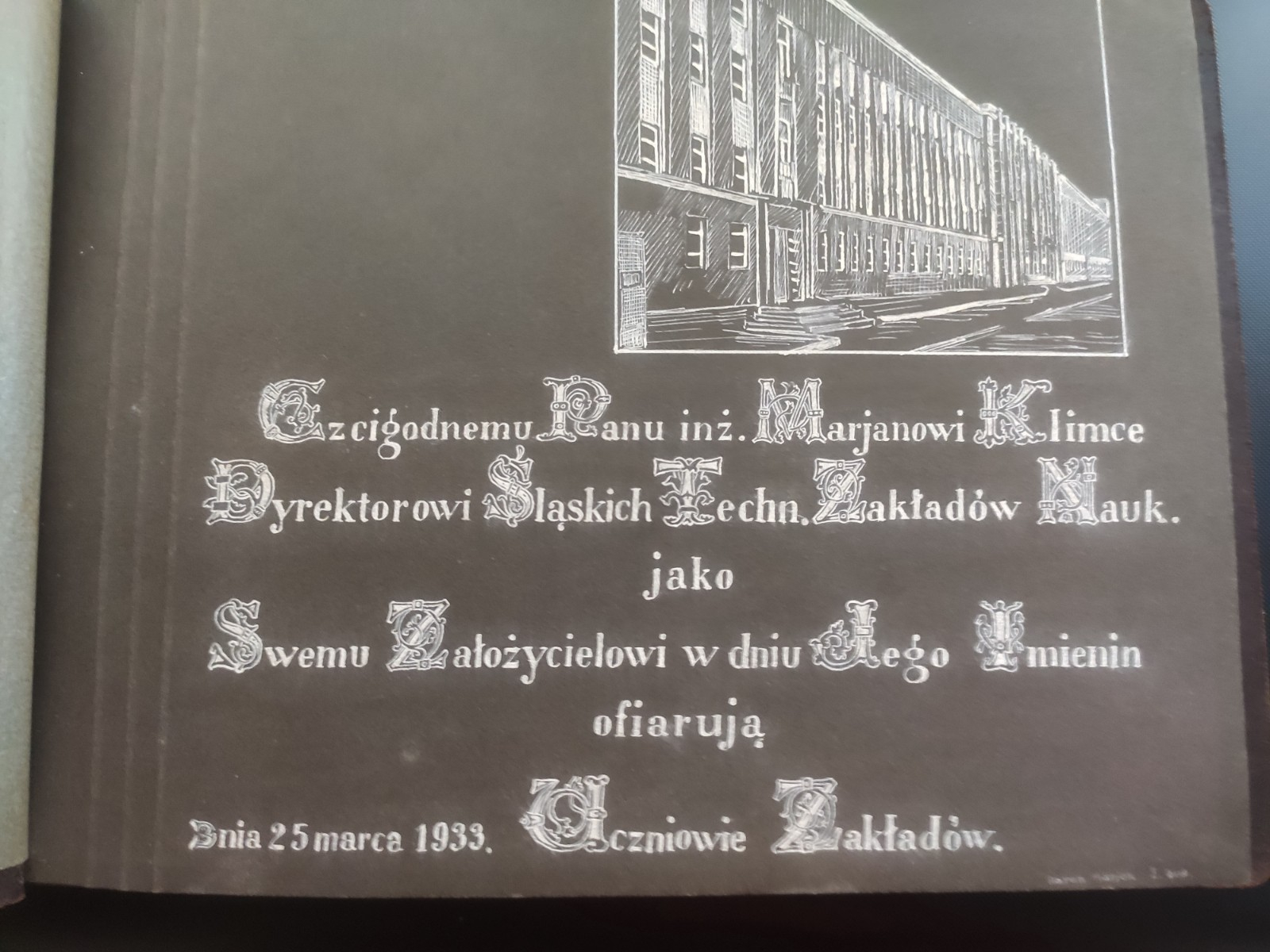Zawiera na stronie tytułowej dedykację: „Czcigodnemu Panu inż. Marjanowi Klimce Dyrektorowi Śląskich Techn. Zakładów Nauk. Jako Swemu Założycielowi w dniu Jego Imienin ofiarują Uczniowie Zakładów Dnia 25 marca 1933.”