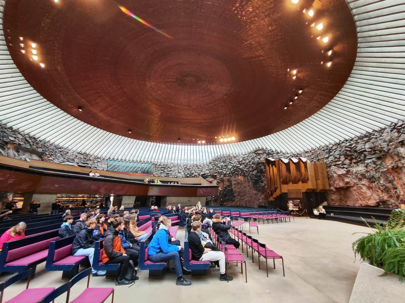 Odwiedziliśmy także niezwykły kościół w skale (Temppeliaukio) – jedną z największych atrakcji Helsinek. Świątynia została wykuta bezpośrednio w litej skale, a jej wnętrze przykrywa charakterystyczna miedziana kopuła. To wyjątkowe miejsce zachwyca nie tylko wyglądem, ale też akustyką, dzięki której często odbywają się tu koncerty.