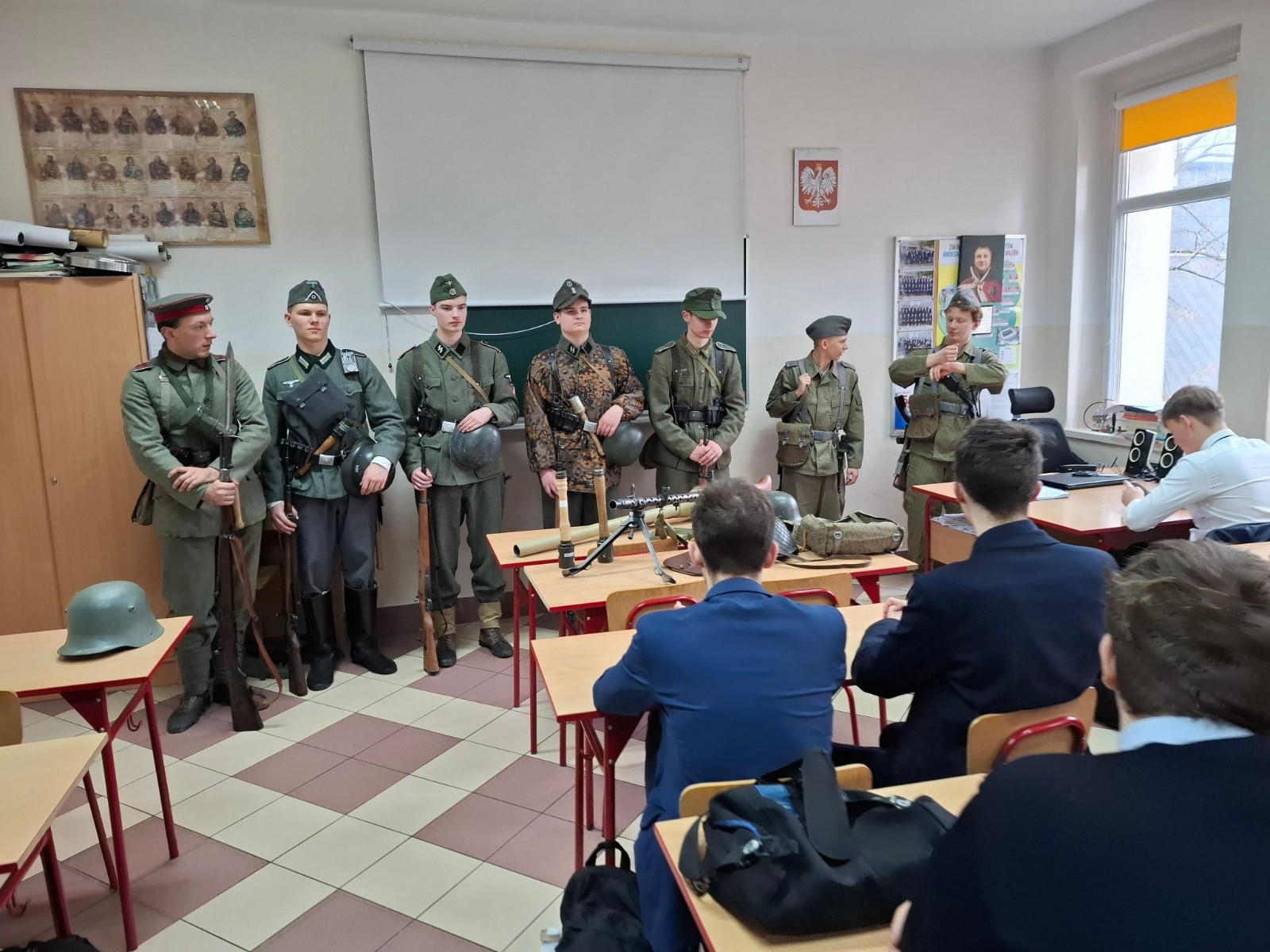 5 lutego 2026 w naszej szkole odbyły się zajęcia z udziałem grupy rekonstrukcyjnej w historycznych mundurach. Chłopcy reprezentowali i przedstawili różnorodne formacje wojskowe: Wehrmacht, Waffen SS, żołnierze Grenzgruppen NRD oraz żołnierz armii Cesarstwa Niemieckiego z czasów I wojny światowej.