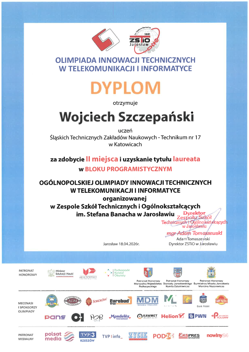 Wojciech Szczepański, uczeń klasy 4D, zajął 2 miejsce w bloku programistycznym. Mateusz Stańczyk i Dawid Rezler, uczniowie klasy 3D, zajęli odpowiednio 6 i 9 miejsce w bloku teletechnicznym.