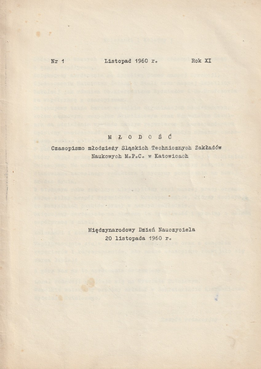W 2024 roku otrzymaliśmy w darze kilka egzemplarzy młodzieżowego czasopisma „Młodość” z lat 60-tych XX w. Ofiarował je wraz z listem do Dyrekcji Śl.TZN Pan Grzegorz Pucka. Darczyńca napisał, m.in. że w latach 1958 – 1963 był uczniem Wydziału Hutniczego w klasie o specjalności odlewnictwo; jego wychowawcą był dr Jerzy Sikora. W latach szkolnych był również członkiem Kolegium Redakcyjnego czasopisma „Młodość”, którego egzemplarze pieczołowicie przechowywał i teraz przesłał w nadziei wzbogacenia archiwum Śląskich Technicznych Zakładów Naukowych – „najwspanialszej średniej uczelni technicznej w historii Europy” (cyt.)