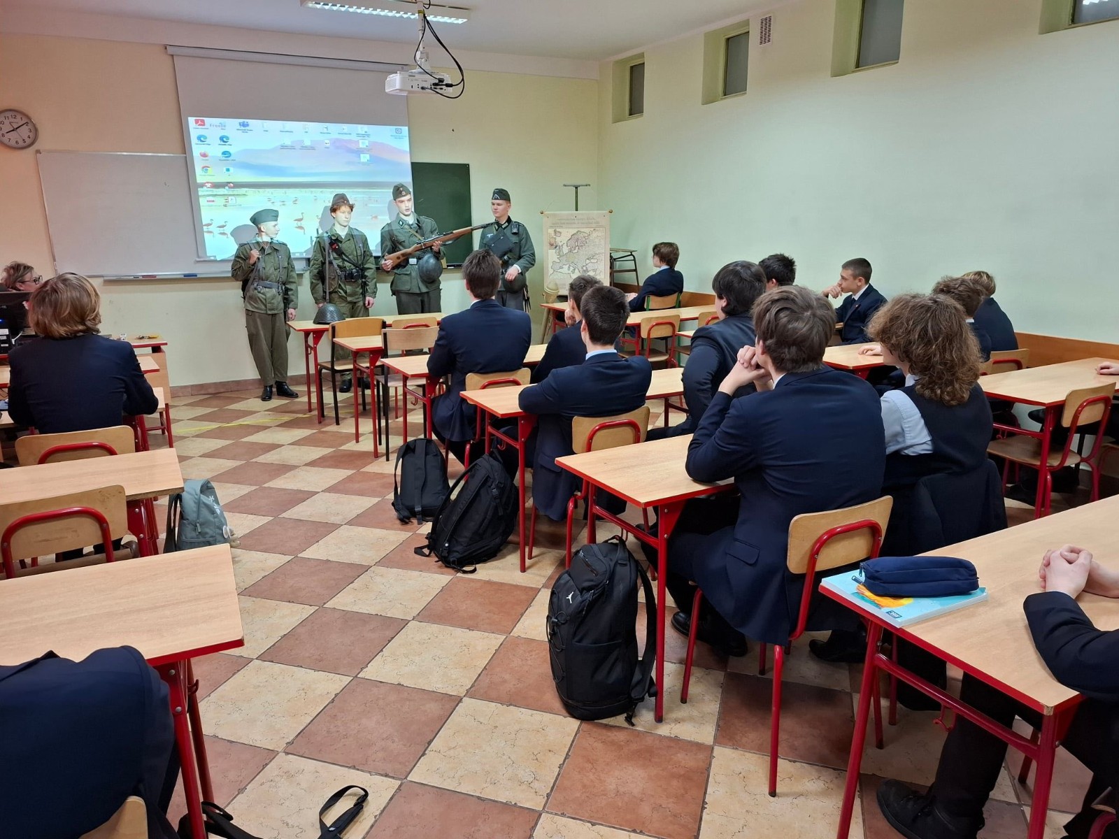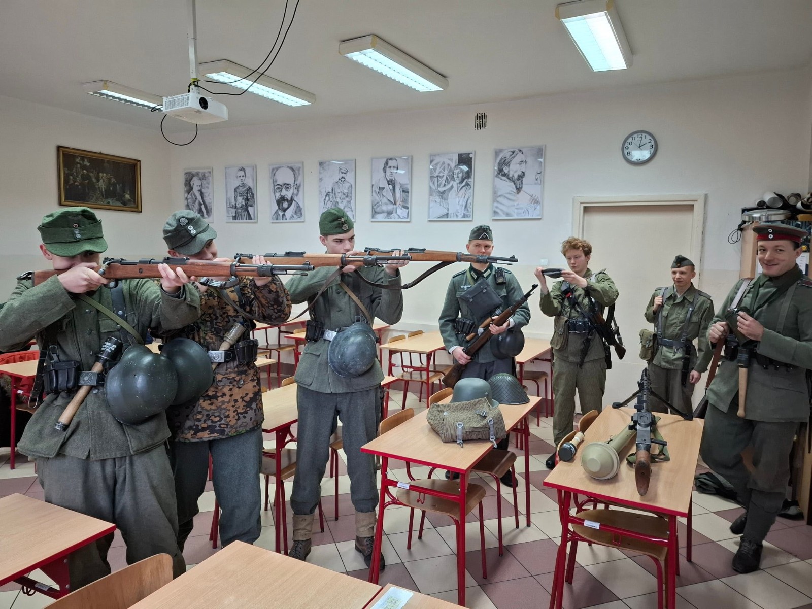 5 lutego 2026 w naszej szkole odbyły się zajęcia z udziałem grupy rekonstrukcyjnej w historycznych mundurach. Chłopcy reprezentowali i przedstawili różnorodne formacje wojskowe: Wehrmacht, Waffen SS, żołnierze Grenzgruppen NRD oraz żołnierz armii Cesarstwa Niemieckiego z czasów I wojny światowej.